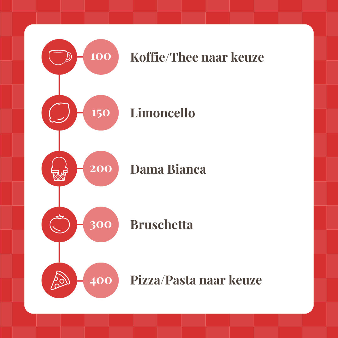Wel, dat is een goede vraag!Voor elke euro die je spendeert bij Da Giovanni krijg jij één punt in de plaats.Door deze punten te sparen, kan jij deze uiteindelijk in wisselen.In wat? Dat zie je hieronder 👇🏼